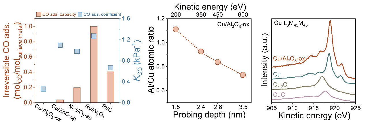 图 3催化剂的耐CO机理及结构表征。(a)反应温度下的静态吸附揭示Al2O3/Cu催化剂上不可逆吸附CO量极低;(b)催化剂表面近区元素深度剖析揭示反相Al2O3/Cu结构;(c) Cu俄歇电子谱揭示Cu主要以金属态存在。